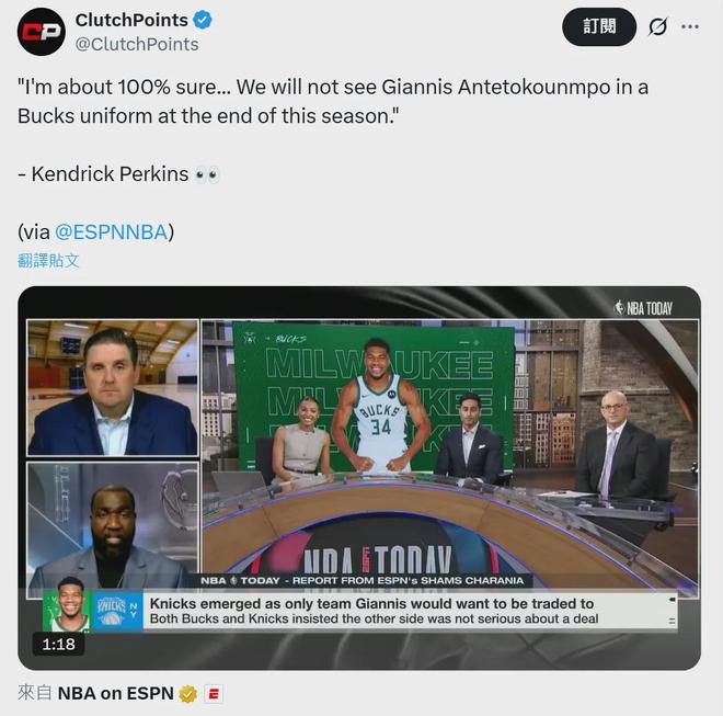 NBA退役球员、评论员帕金斯更是拍了胸脯打包票:“字母哥已经确定要离开了,听着,我几乎百分之百肯定,当然这只是我个人基于现有信息的推测,并非官方消息,我们不会看到字母哥在本赛季结束时还身披雄鹿球衣。”