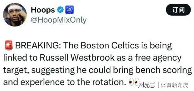 另一方面,据美国媒体Hoops报道,凯尔特人队有意在自由市场上签下威斯布鲁克,旨在增强球队替补阵容的得分能力与比赛经验。