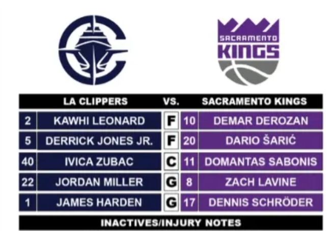 今天比赛,首发阵容方面,快船队这边,泰伦卢排出的首发五人组为:詹姆斯-哈登、小德里克-琼斯、科怀-伦纳德、乔丹-米勒、伊维察-祖巴茨;国王队这边,首发阵容则为:施罗德、拉文、德罗赞、沙里奇、小萨博尼斯。