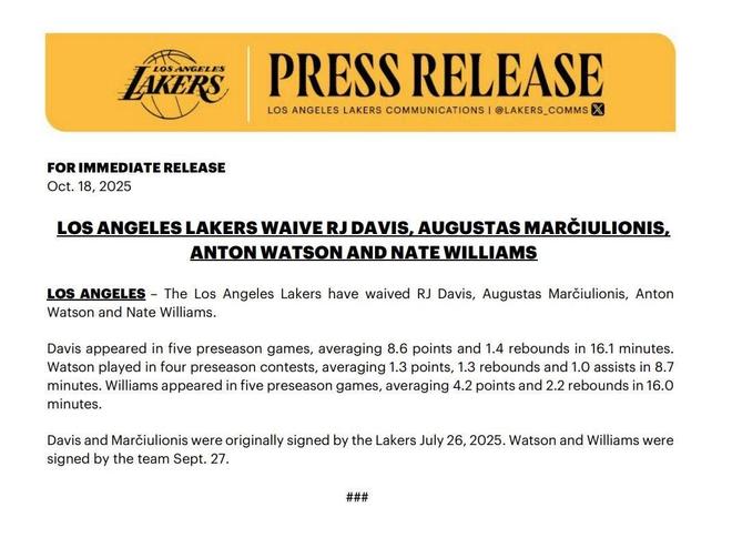 湖人官方表示:球队裁掉RJ-戴维斯、奥古斯塔斯-马修利奥尼斯、安东-沃特森和内特-威廉姆斯(杰纳森-威廉姆斯)。