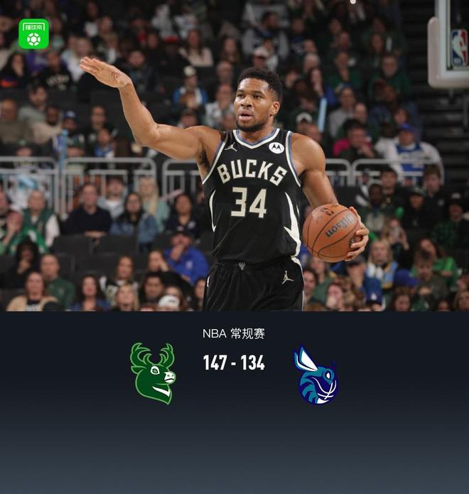 加时赛雄鹿字母哥拿下6分,黄蜂迈尔斯-布里奇斯拿下5分,最终雄鹿147-134战胜黄蜂