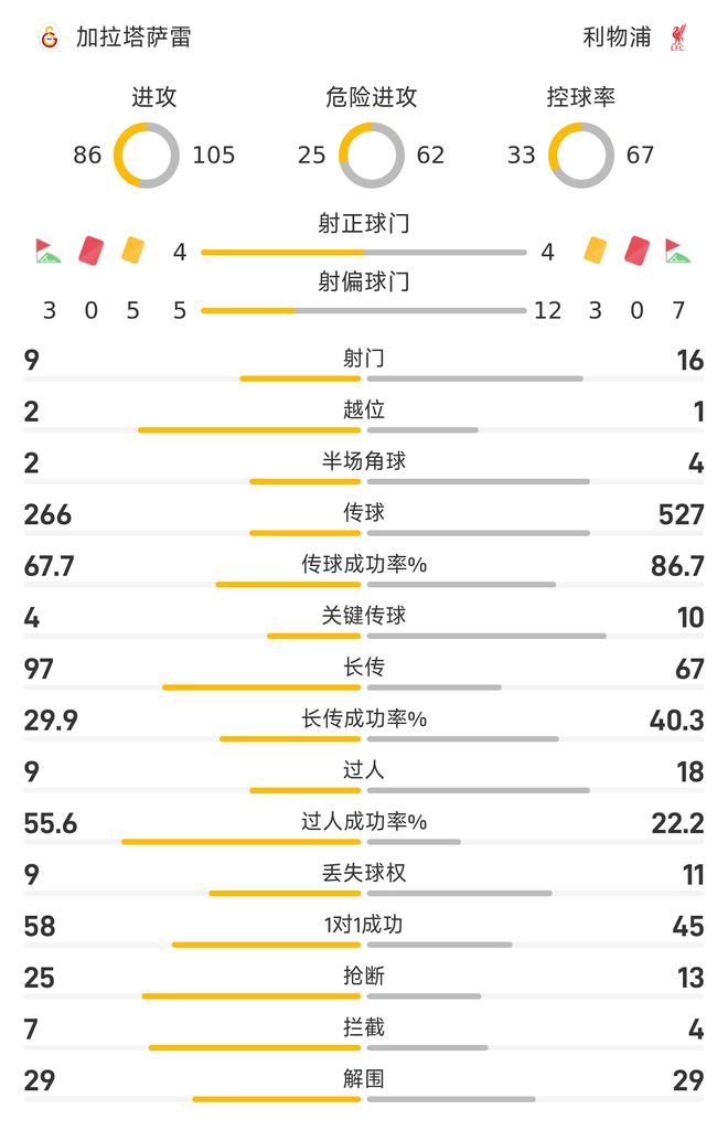 纵观全场比赛,利物浦在射门方面以16-9明显高出对手,但其中射门方面双方皆是4次平分秋色。在控球率方面,利物浦则以67%-33%明显高出对手。
